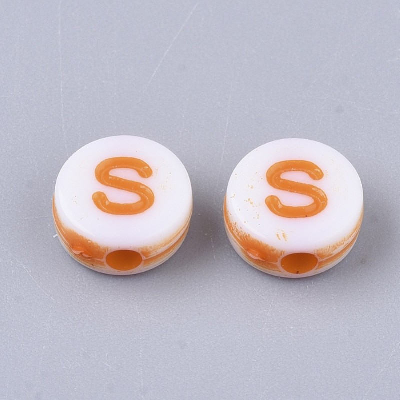 Paquete de 100 abalorios Blancos con letras de colores. Material acrilico. Tamaño 7x3mm, agujero 1,6mm. Empacadas de forma aleatoria.