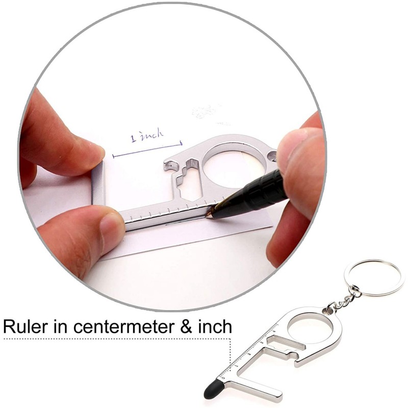 Muchas herramientas en una pieza: abrir puertas sin contacto, llavero , lápiz capacitivo, destornillador hexagonal, regla, abridor de botellas, soporte para smartphone, tocar botones sin contacto