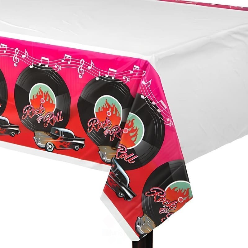Paquete decoración de mesa de rock and roll, para 16 invitados contiene:1 mantel, 16 platos, 16 servilletas, confeti y 3 decoraciones 3D para centro de mesa, todo para su fiesta temática de los años 50´s