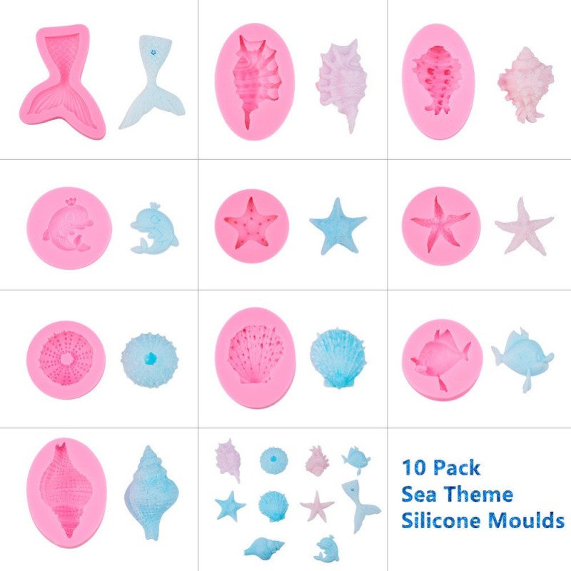 Paquete de 10 moldes de silicone con temas del mar.