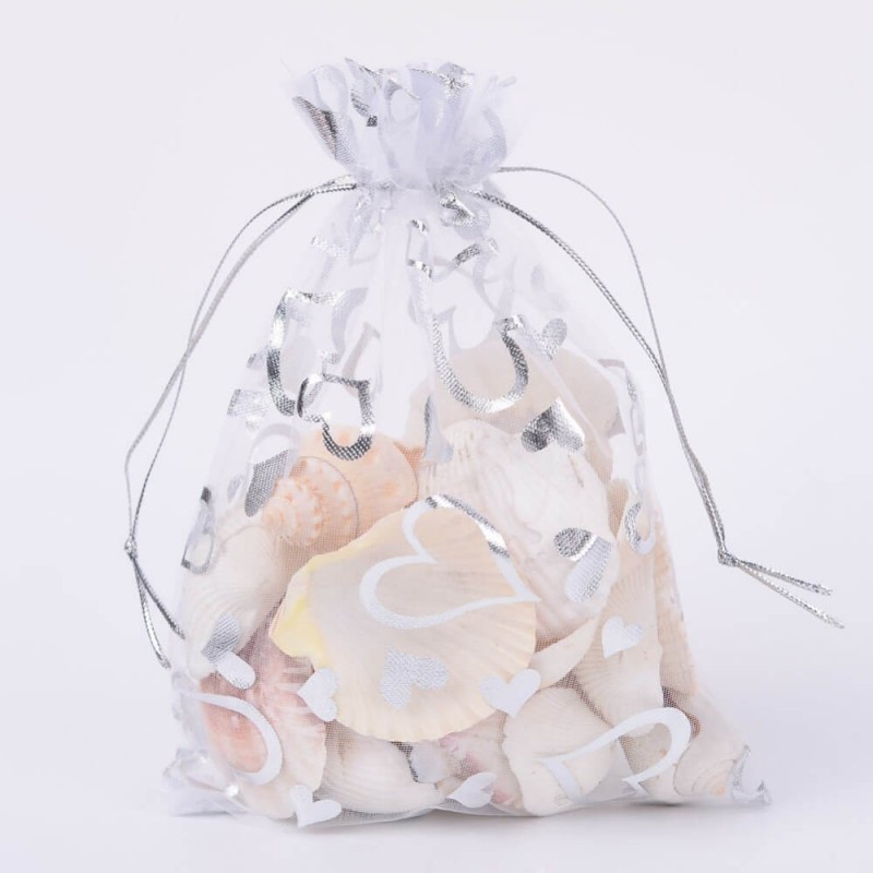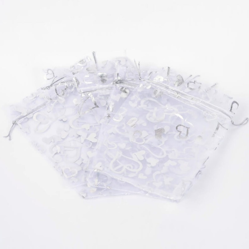 Paquete con 10 bolsas de organza blancas estampados con corazones plateadas. Tamaño 18x13cms