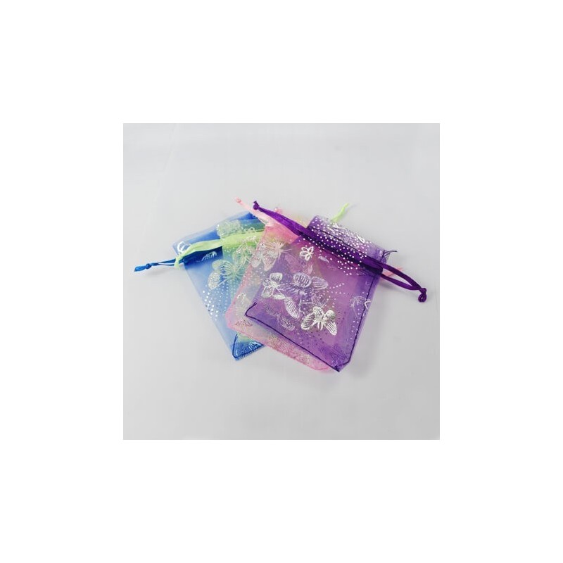 Paquete con 10 bolsas de organza de colores con estampado de mariposas plateadas. Tamaño 7x9cms