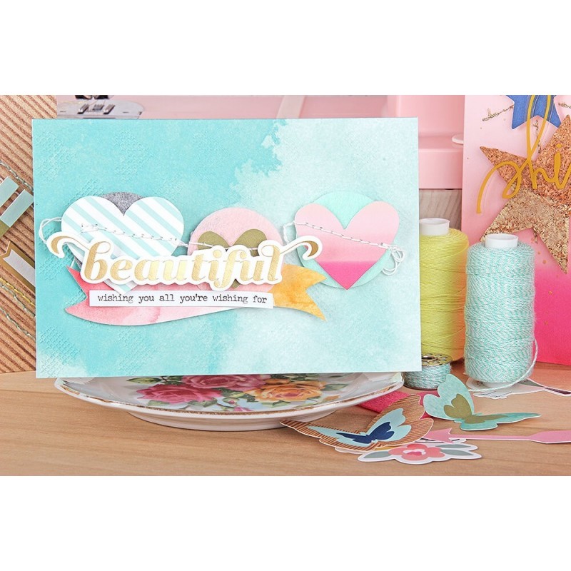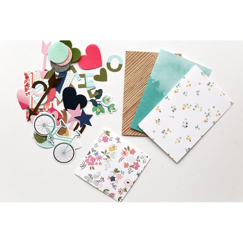 Contiene 61 piezas: 10 tarjetas, 10 sobres, 35 die cuts (figuras), 3 corazones de fieltro y 3 cículos de fieltro