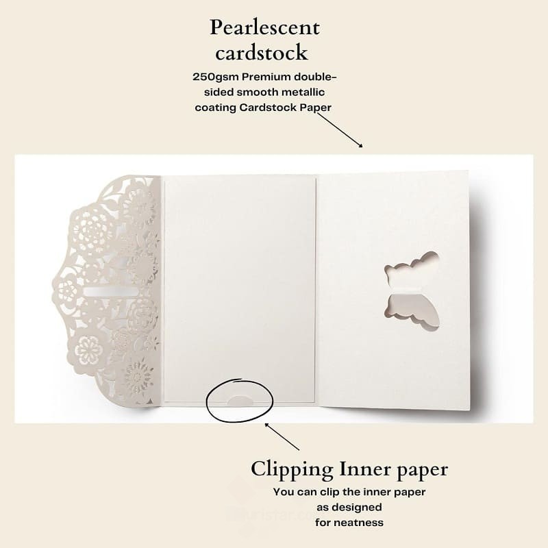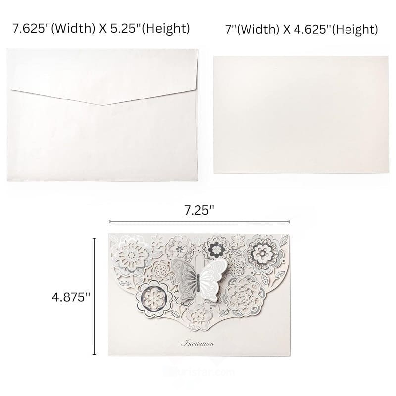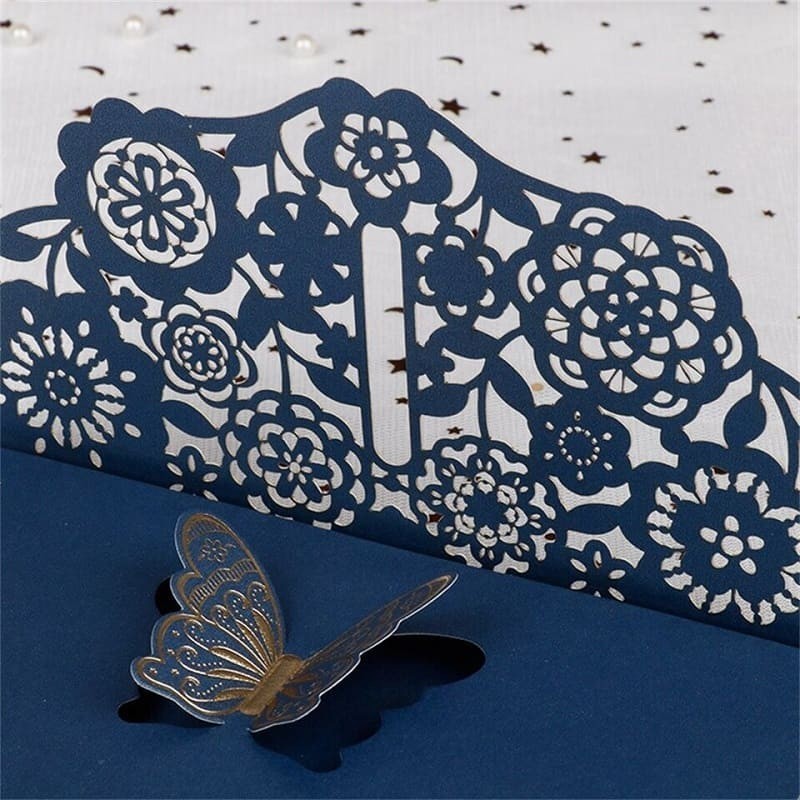 Paquete de 25 invitaciones de mariposa y su sobres color azul marino.
